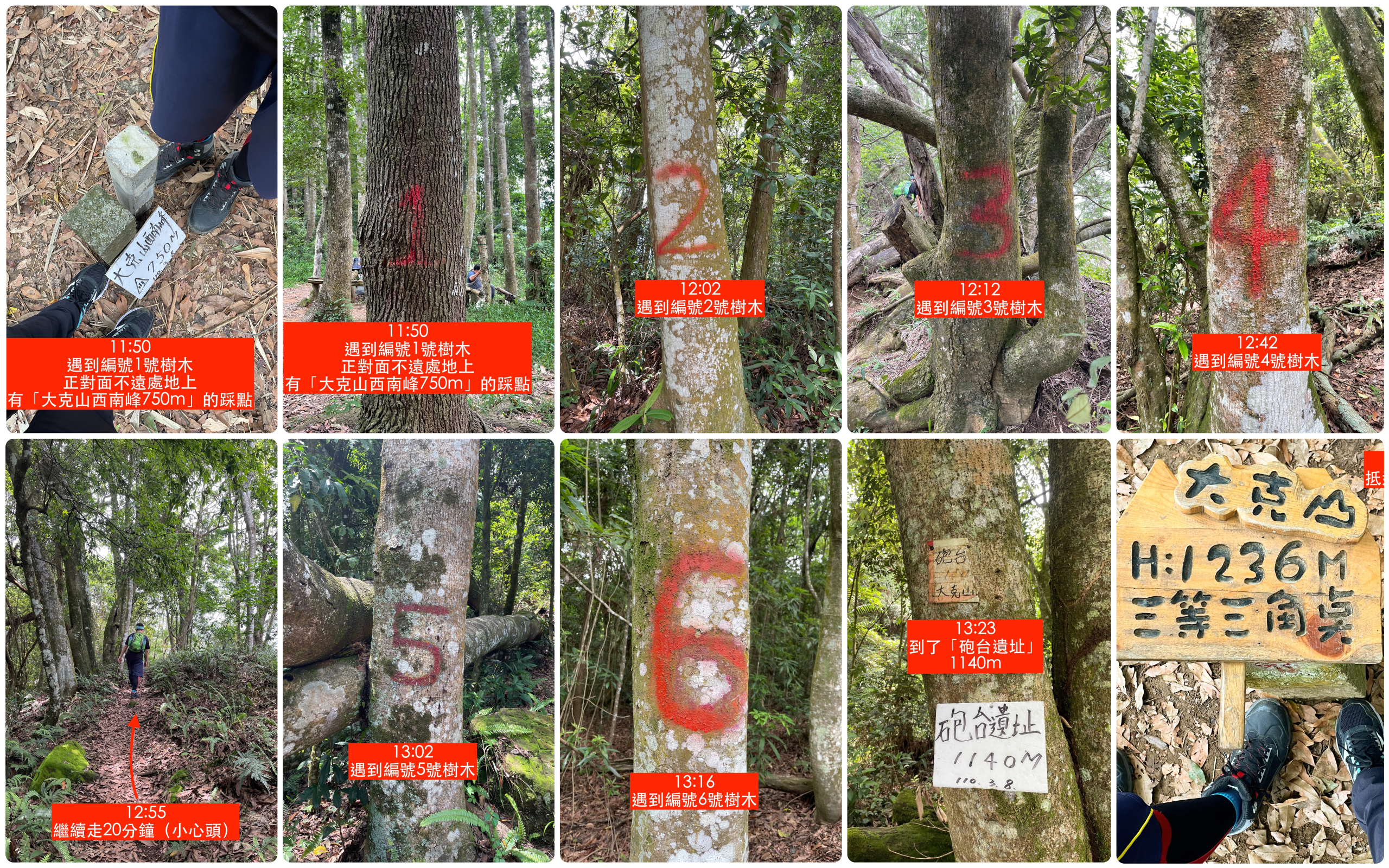 11:50遇到編號1號樹木(正對面不遠處地上有「大克山西南峰750m」的踩點)➠走12分鐘(小心頭)➠